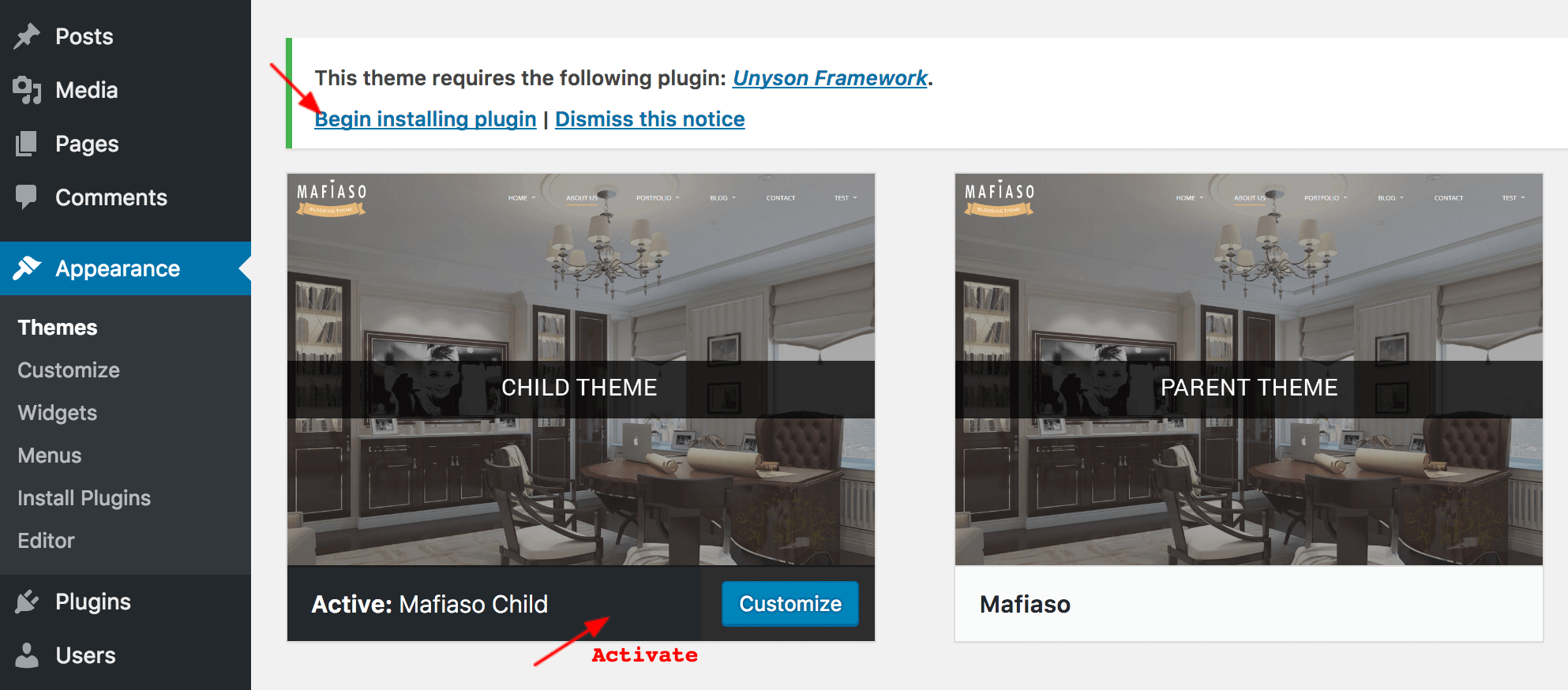 • After Mafiaso theme is uploaded, click Activate mafiaso-child.