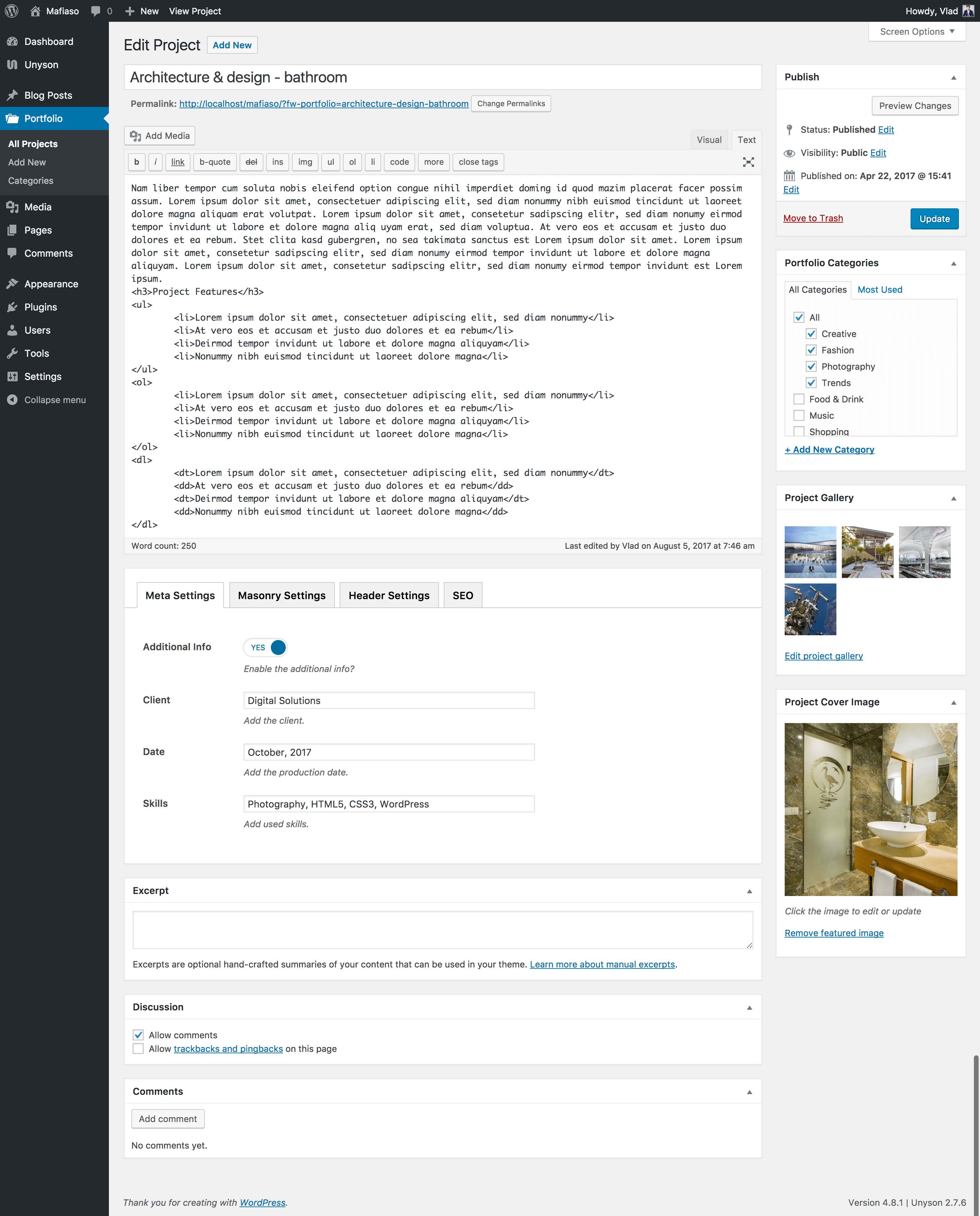 Portfolio post type is usually used to present your works and projects. Portfolio Posts consist of many elements. It has a gallery upload option which give you the possibility to upload many images for your project.