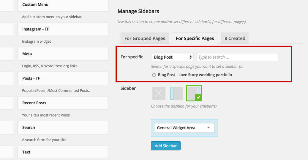 1. Lets add a new sidebar to a specific blog post. In order to do that, select the For Specific Pages tab.