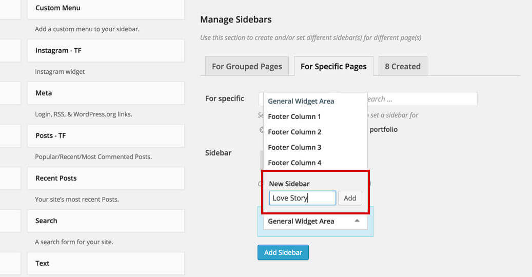 This theme comes with a special built in sidebar module that will let you add different sidebars to different pages. Follow these steps in order to add a new sidebar to a page or blog post: