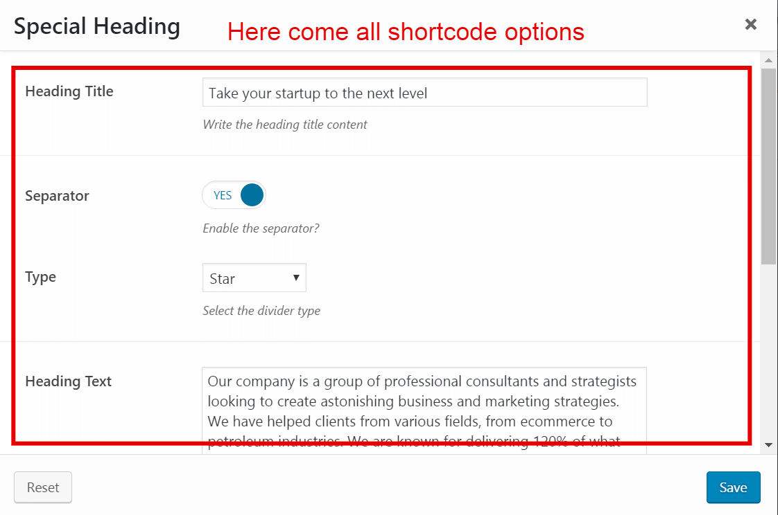 Each shortcode are similar in use an they can be added very easy by clicking on them or dragging them in the content. The difference between them are the options provided. Each shortcode have different options with deatailed desription