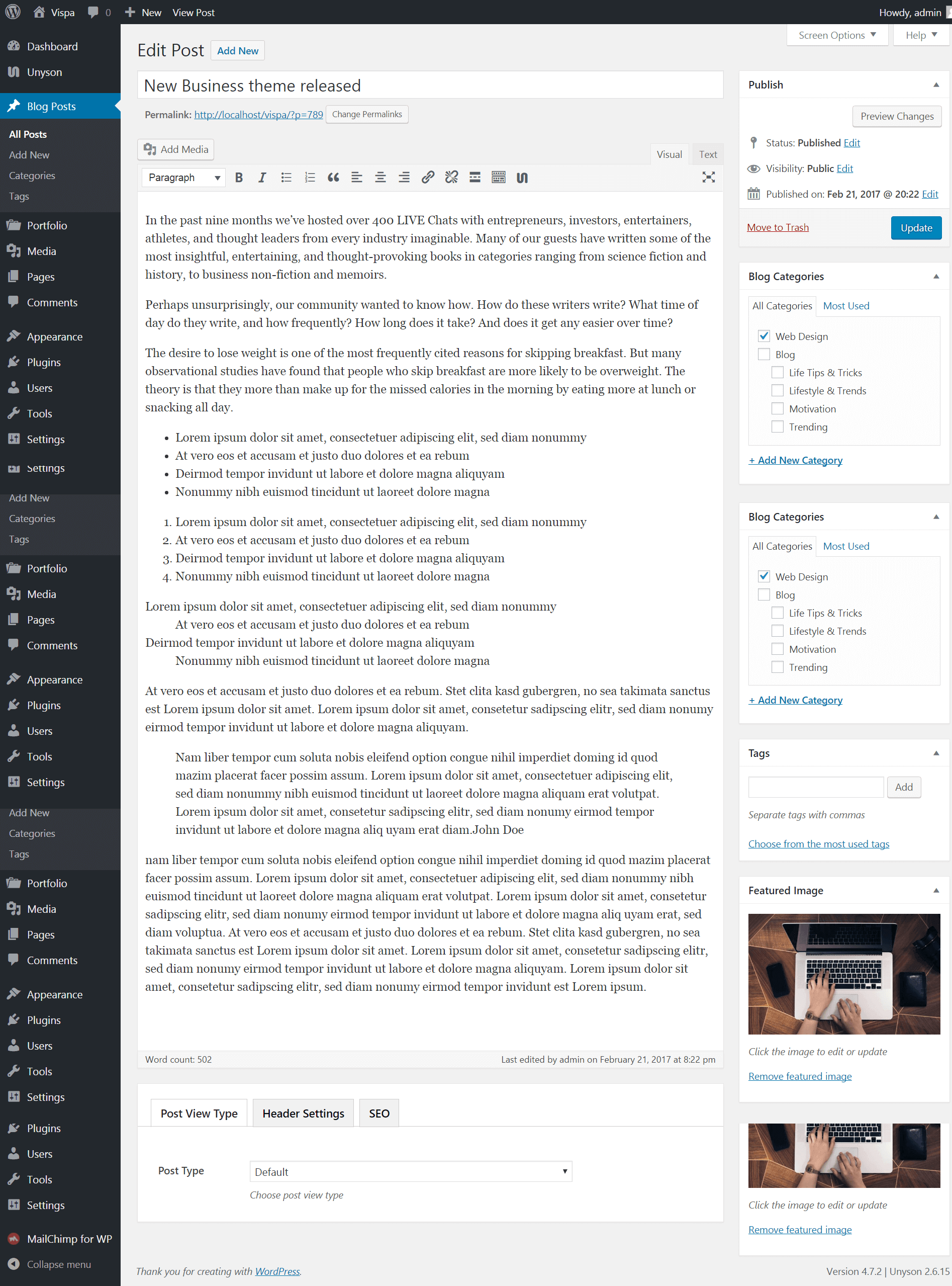 Posts are entries on your Blog that are shown in a reverse chronological order on the front page of your Blog. While using our theme, thanks to WordPress Posts, you can create a typical Blog or news about your company.